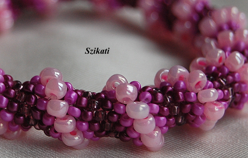 Absolute unique, eye-catching shape and design, with a wonderful combination of 4 sizes of purple and pink seed beads.
