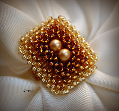 One-of-a-kind statement beadwoven brooch made of pearls and gold-lined translucent Czech seed beads.