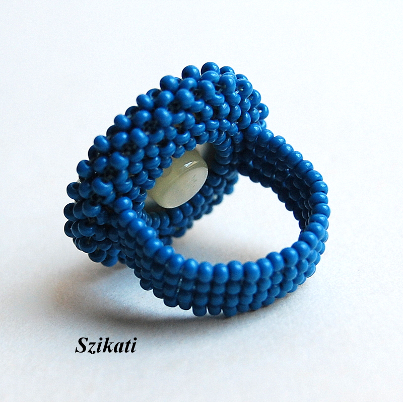 Elegant one-of-a-kind statement beadwoven cocktail ring made of a nacreous white button and flat blue seed beads.