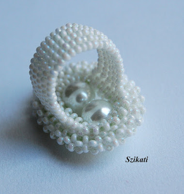 Elegant one-of-a-kind beadwoven necklace, multistrand bracelet and cocktail ring made of silky white pearl beads and white seed beads.